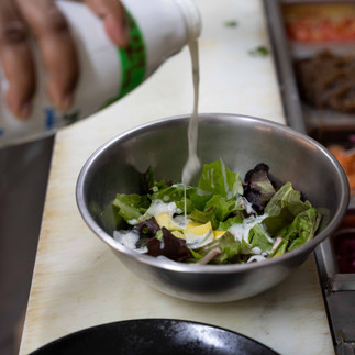 En un Bowl metalico, preparamos la ensalada. Cogemos el mezclum previamente lavado y desinfectado, ponemos el mango y agregamos el yogurt. Revolvemos muy bien.